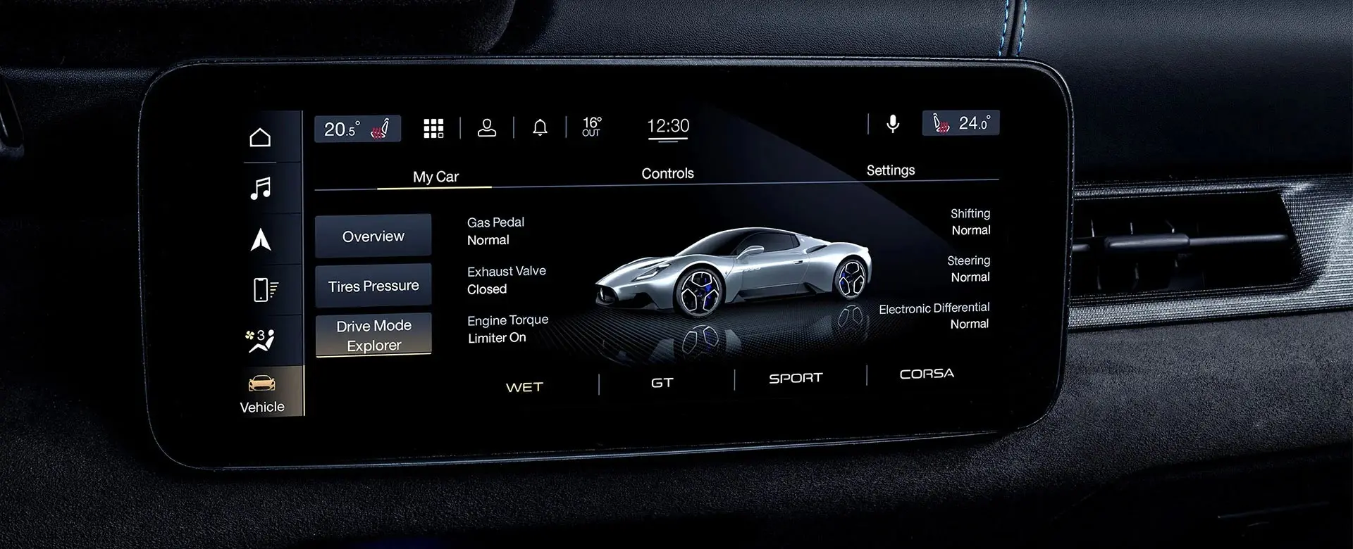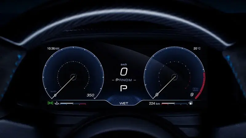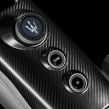 In the driver's seat, nothing distracts from the sporty experience. Essentials-only interior – each component serves a practical purpose. Inspired by luxury watches, the precious mechanical drive mode selector graces the Carbon Fibre central tunnel, reminding everyone onboard they are in a Maserati.